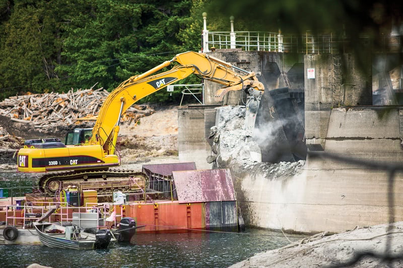 A barge-mounted excavator hammers away at Glines Canyon Dam, the largest dam removal in U.S. history. Elwha River, Olympic National Park, Washington in a scene from DAMNATION. Photo: Ben Knight