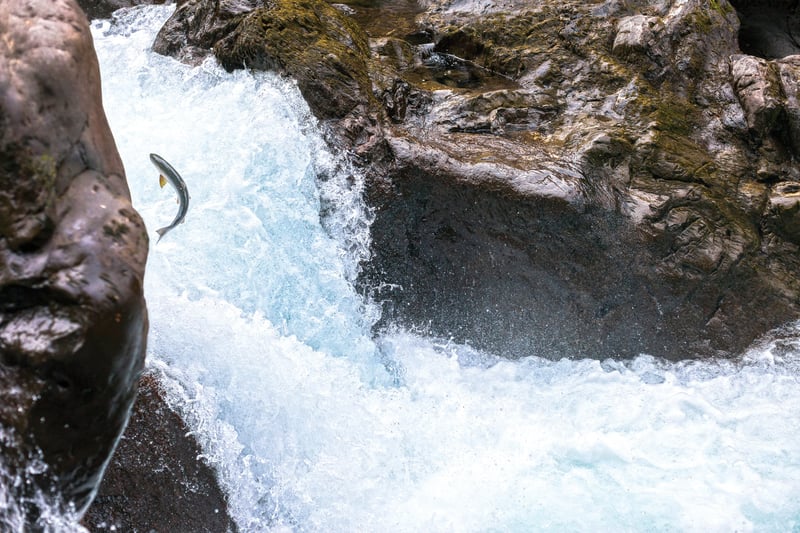 In order to reach their spawning grounds in Olympic National Park, salmon and steelhead on Washington’s undammed Sol Duc River must launch past a waterfall known as the Salmon Cascades in a scene from DAMNATION. Photo: Travis Rummel