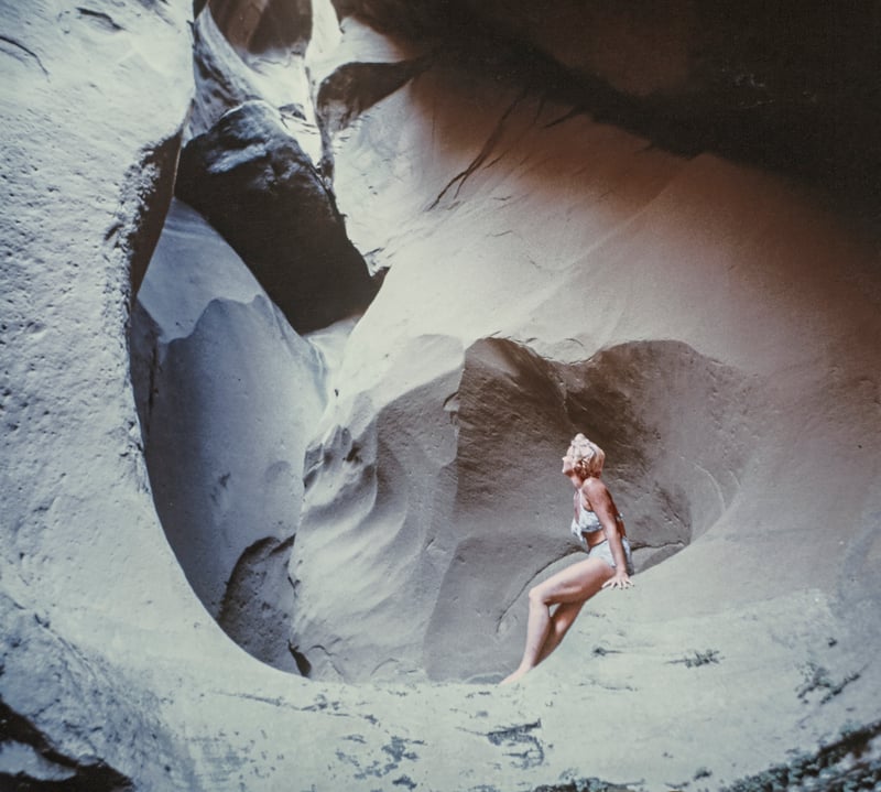 Katie Lee reflects in one of Glen Canyon's magical side canyons before they were flooded in 1963 by the completion of Glen Canyon Dam and what she calls “Res Foul” (aka Lake Powell) in a scene from DAMNATION. Photo: Katie Lee Collection