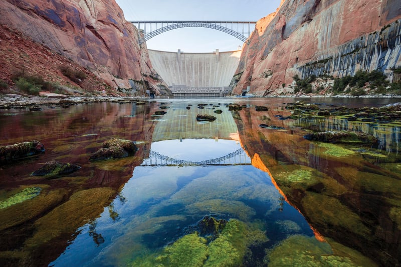Extremely cold water trickles out of the Glen Canyon Dam into what's left of Glen Canyon, forming an unnatural stretch of trout water on the Arizona/Utah border in a scene from DAMNATION. Photo: Ben Knight