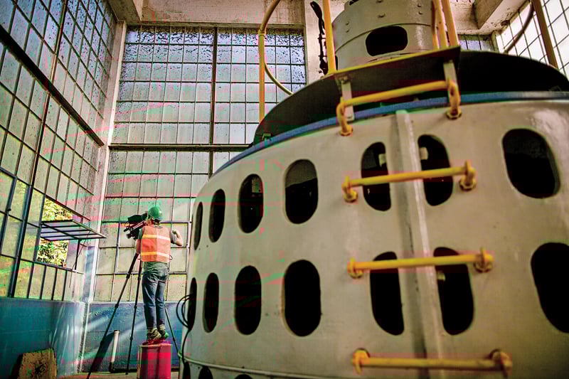 Ben Knight films inside the nearly century old Elwha Dam powerhouse before its deconstruction in a scene from DAMNATION. Photo: Travis Rummel