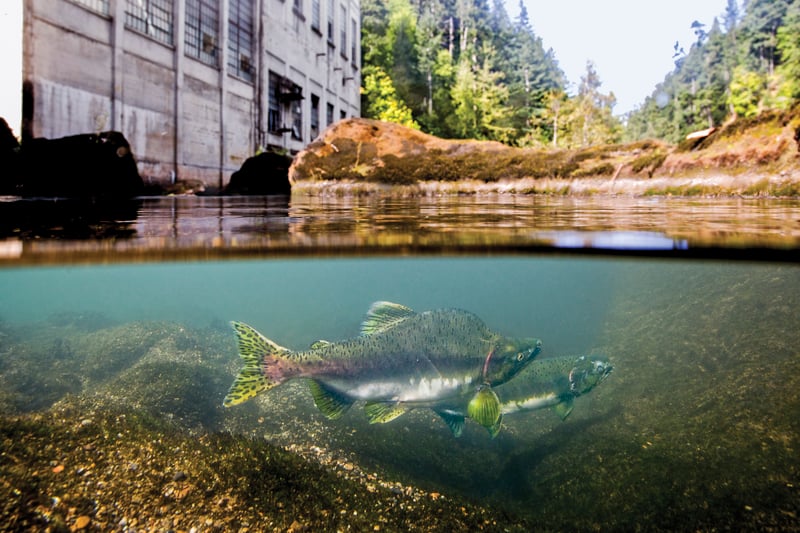 Prevented from migrating any further upstream, a spawning pair of pink salmon flirt over a gravel bed a stone’s throw from the now removed Elwha Dam powerhouse in a scene from DAMNATION. Photo: Matt Stoecker