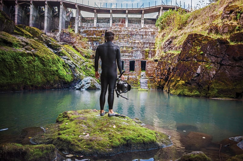 The former Elwha Dam looms overhead as DamNation producer and underwater photographer Matt Stoecker prepares to film Chinook salmon trapped below the impassable wall of concrete in a scene from DAMNATION. Photo: Travis Rummel